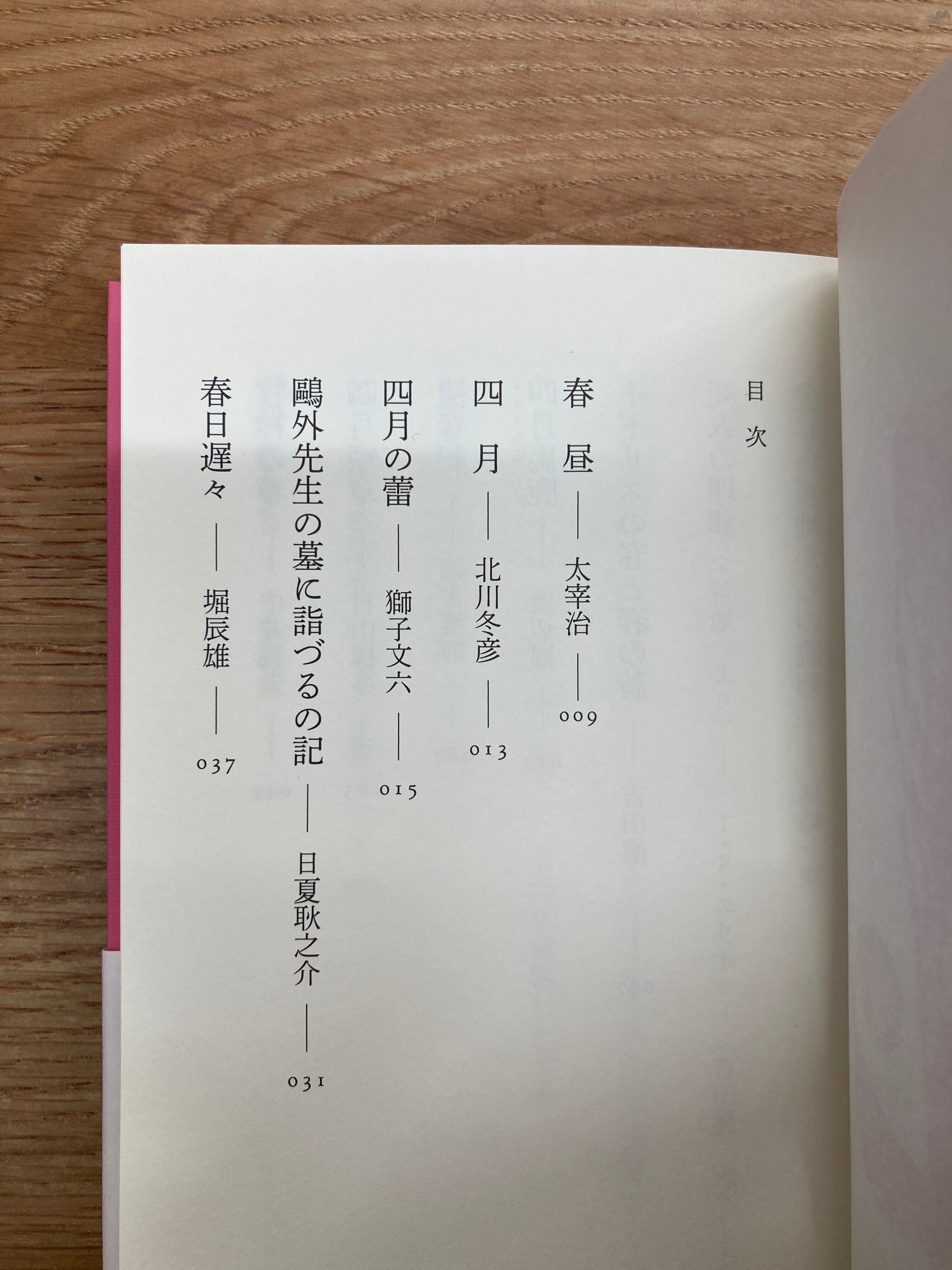 「春昼」太宰治、「牧神の春」中井英夫、「イギリスの春と春の詩」吉田健一、「春雪」久生十蘭、「まどわしの四月」片山廣子ほか全21篇を収録
