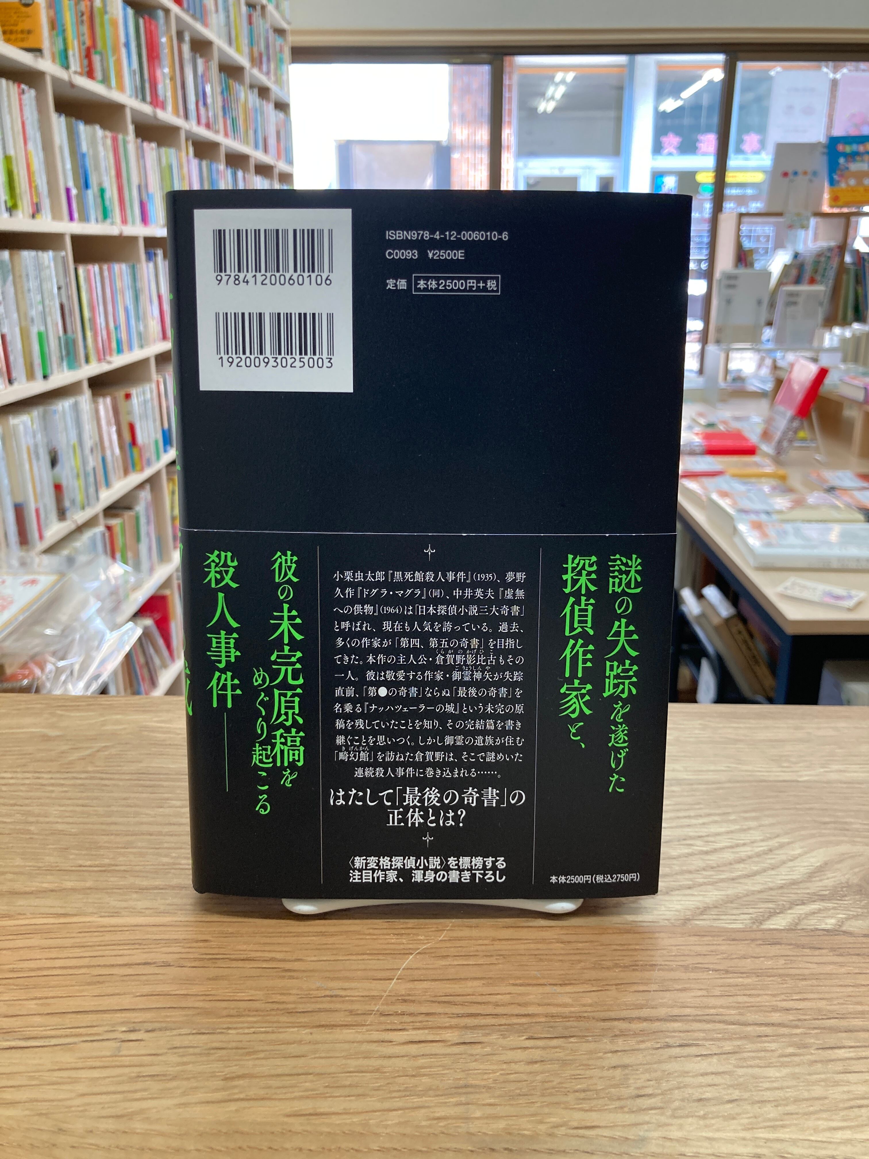 小栗虫太郎『黒死館殺人事件』(1935)、夢野久作『ドグラ・マグラ』(同)、中井英夫『虚無への供物』(1964)は「日本探偵小説三大奇書」と呼ばれ、現在も人気を誇っている。過去、多くの作家が「第四、第五の奇書」を目指してきた。本作の主人公・倉賀野影比古もその一人。彼は敬愛する作家・御霊神矢が失踪直前、「第●の奇書」ならぬ「最後の奇書」を名乗る『ナッハツェーラーの城』という未完の原稿を残していたことを知り、その完結篇を書き継ぐことを思いつく。しかし御霊の遺族が住む館を訪ねた倉賀野は、そこで謎めいた連続殺人事件に巻き込まれる……。(帯より)